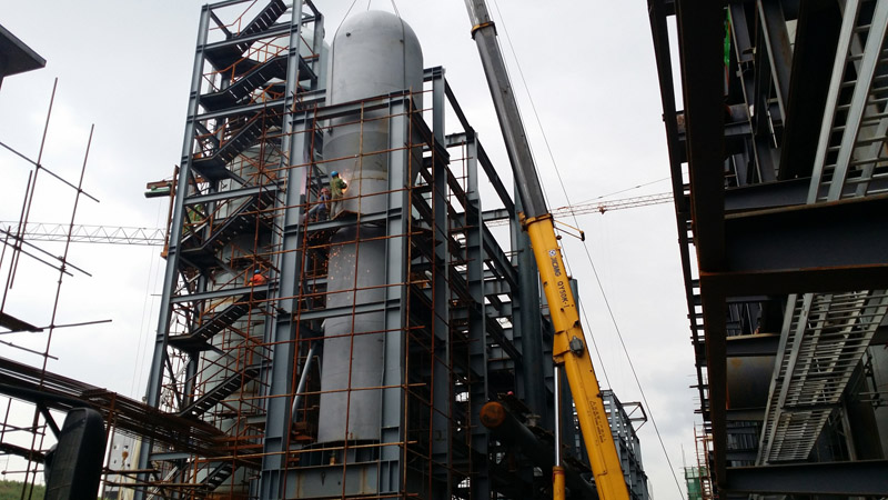 由我公司承建的抚顺矿业集团页岩炼油胜利实验厂油页岩分级干馏项目F、G部加热炉工程现正在紧锣密鼓的施工中,本工程是既新疆宝明、吉林成大后国内第三个将卡卢金式热风炉应用于瓦斯气加热的瓦斯加热炉,预计9月10日联网调试。图为立管安装。