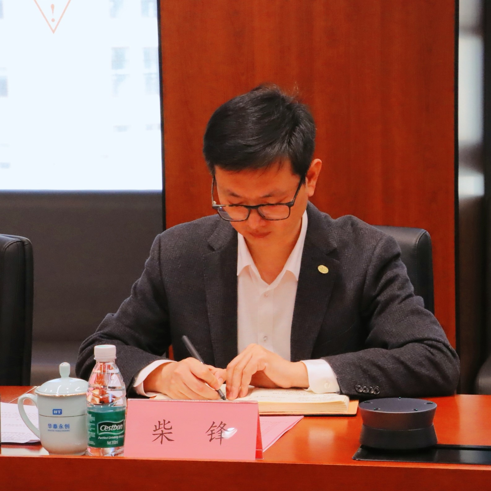 Vice Mayor Chai Feng listens intently as the company outlines its operating development status and requests